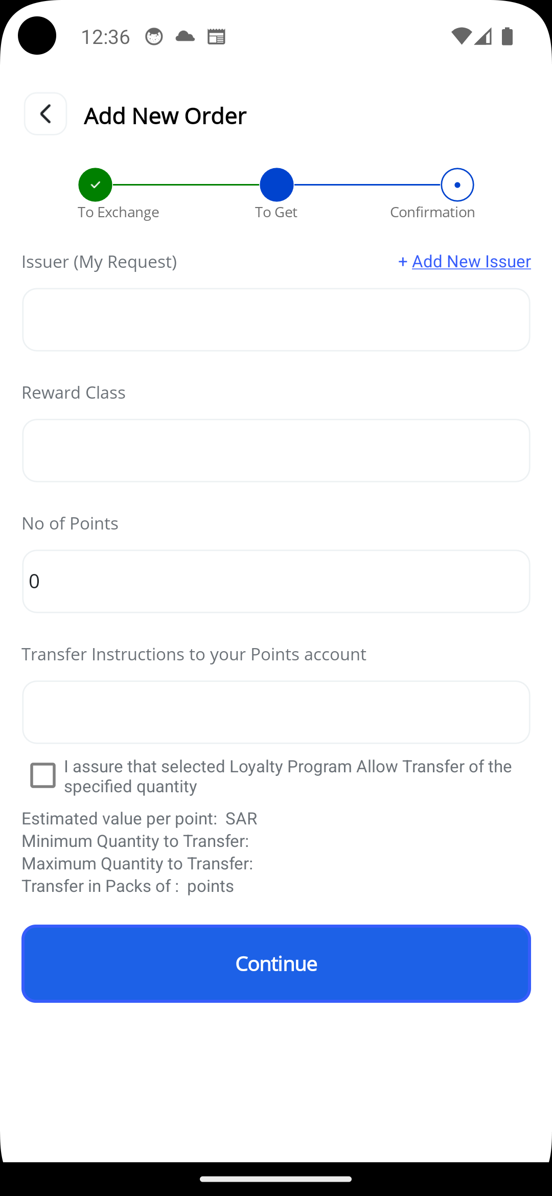 An Order is a request to exchange points placed by you, where other people can see it under Available Offers Section. Before you add a new order, look into Offers section, you might find nd offer that meets your need. if an offer is available, Book the offer and continue as explained in "How to Book an Offer", instead of Adding a New Order