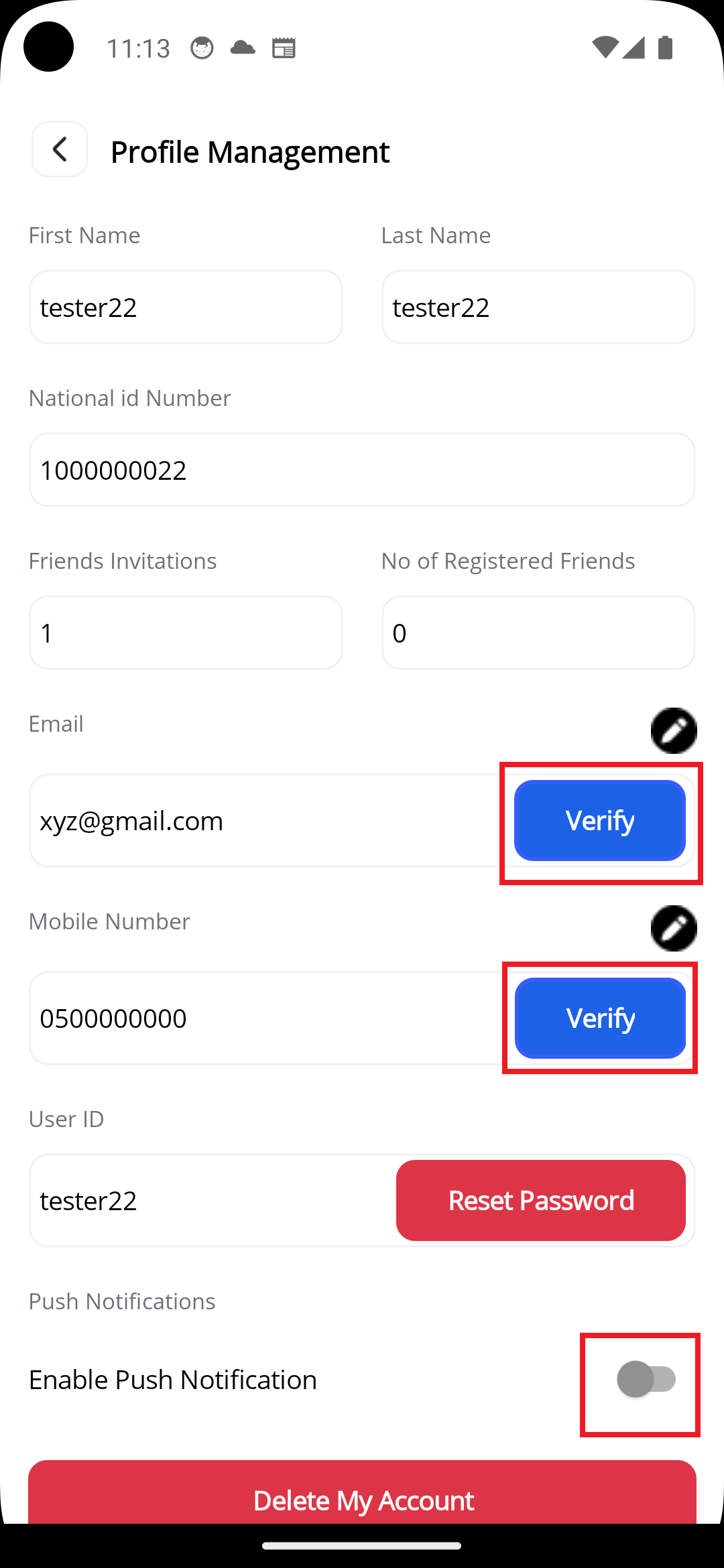 In Profile Management Screen, if your Email Address is not verified yet, you will see Verify button on top of your Email Address field, click on it. It will open a new Screen to enter verification OTP, Check you email account, you will receive an activation code email. Enter the recived OTP and click Continue. After That, App will take you back to Profile Management and you will see verification icon on top of your Email Adress